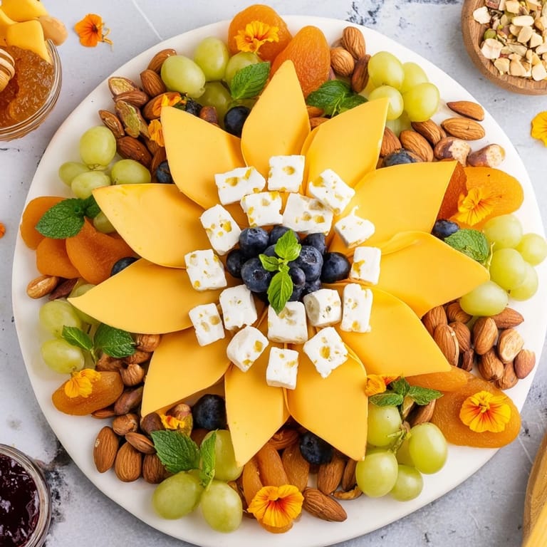 Save A vibrant, spring-inspired cheese board arranged to resemble a blooming daffodil, featuring a mix of cheeses, fruits, nuts, and crackers for a stunning visual centerpiece and delightful tasting experience.