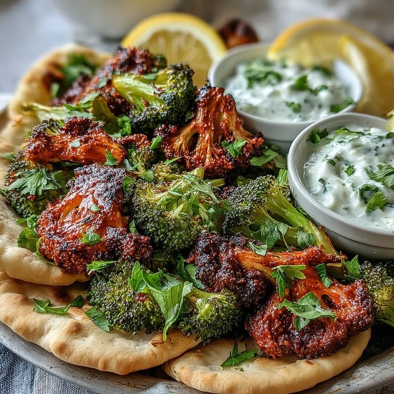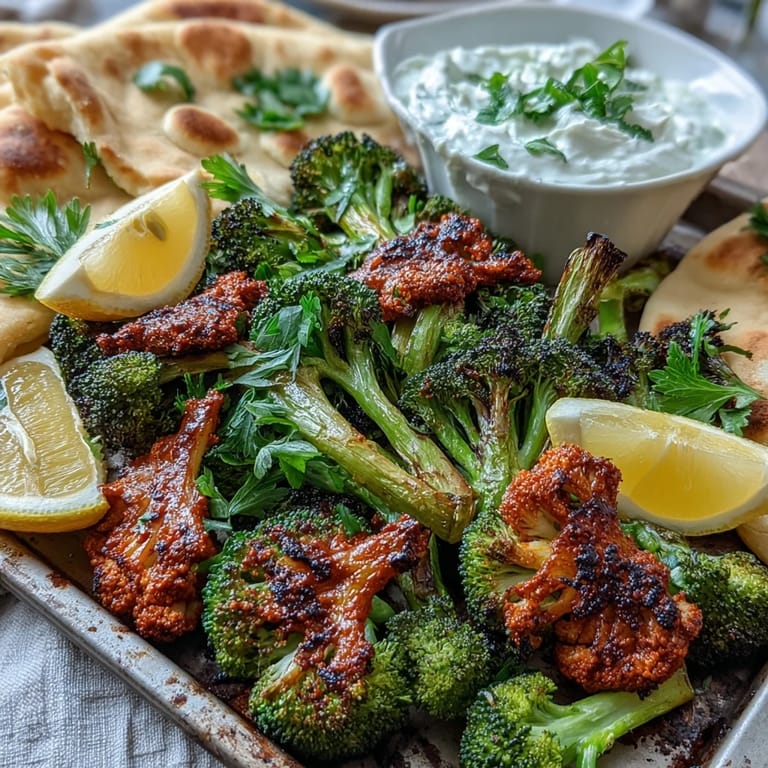 Save A vibrant, spicy one-pan vegetarian meal featuring roasted broccoli tossed in harissa, served with warm flatbreads for a quick and satisfying dinner. This Middle Eastern-inspired dish is perfect for an easy weeknight meal that brings bold flavor with minimal effort.