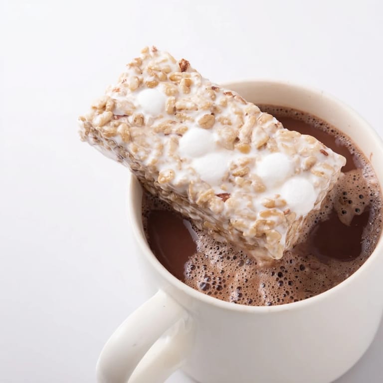 - Pour hot chocolate into mugs. Top each with a marshmallow bar, allowing it to float and melt slightly into the drink.