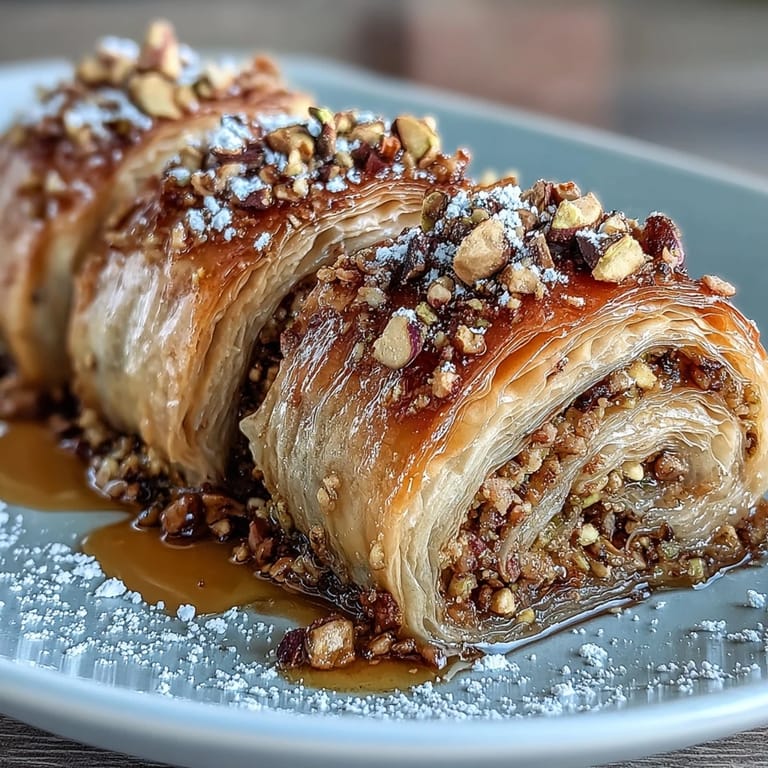 Save The first time I made pistachio baklava rolls, the scent of orange blossom water drifted through the kitchen windows and spilled onto the quiet street outside. At that moment, I wasn't chasing any grand nostalgia – just searching for something both comforting and a little celebratory on a Saturday afternoon. I could hear the crinkle of phyllo as I gently unrolled the sheets, and the kitchen counter became speckled with sugar and emerald pistachios. There was a gentle hum from the food processor, drowned out only by my own anticipation. Those delicate rolls came together in such a hands-on way, their crispness a tiny triumph after impatient waiting.
