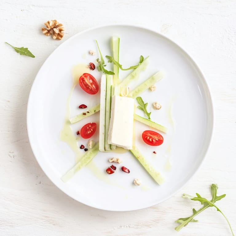 - Arrange the tomato halves, cucumber slices, and watermelon radish in deliberate rows, all angled toward the cheese. They should look organized but not rigid, like nature designed it this way.
