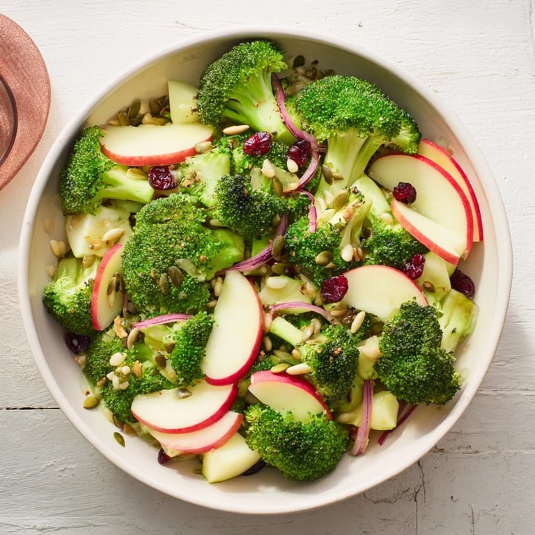 Save A vibrant, fresh salad featuring crisp broccoli and sweet-tart apple, tossed in a zesty dressing for a nutrient-packed, energizing meal.