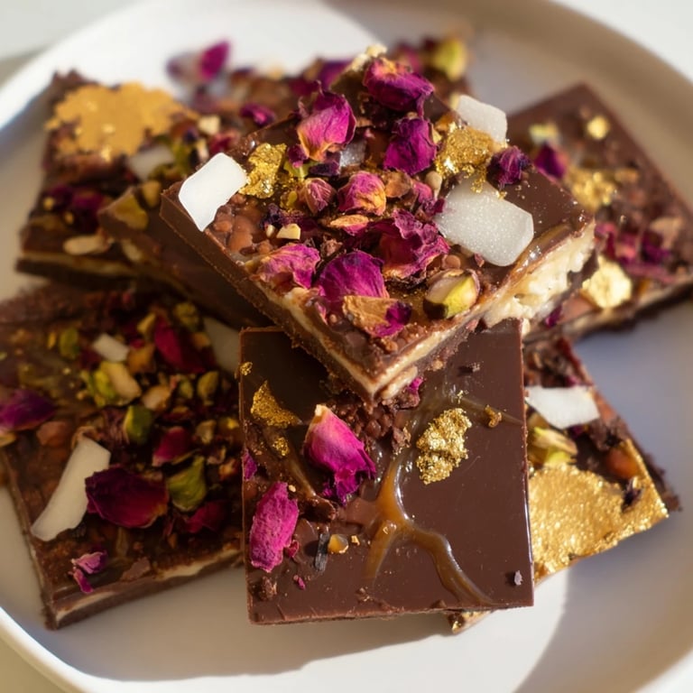 - Remove from the pan and cut into bars or squares. Garnish with edible gold leaf, dried rose petals, and additional chopped pistachios before serving.