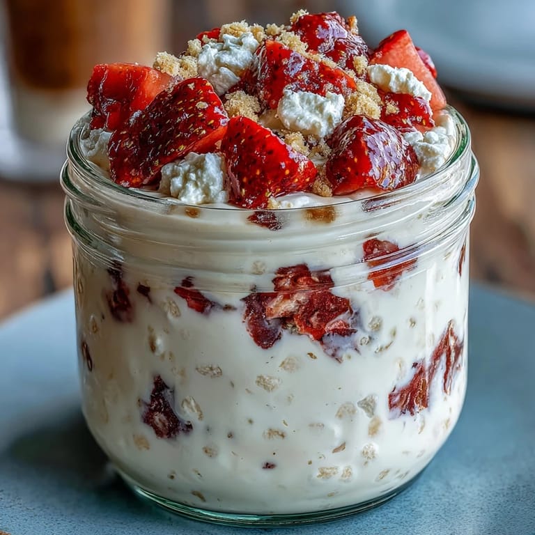 Save Imagine waking up to a breakfast that tastes like indulgent strawberry cheesecake but fuels your body with protein and wholesome oats. These Cottage Cheese Strawberry Cheesecake Overnight Oats bring together the creamy richness of cottage cheese, sweet bursts of fresh strawberries, and the nostalgic crunch of graham cracker crumbs—all in a no-cook recipe you prep the night before. It's the perfect marriage of convenience and nutrition, giving you a satisfying, dessert-inspired start to your day without any guilt.