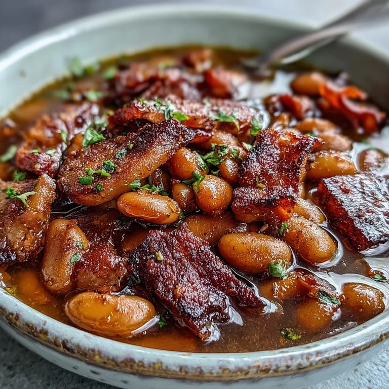 When the beans are nearly tender, grab a wooden spoon and mash a handful of them against the side of the pot, letting them break down into the broth. This creates a naturally creamy texture without any cream or extra ingredients—the starch from the beans does all the work. It's the difference between thin soup and the kind that coats your spoon.