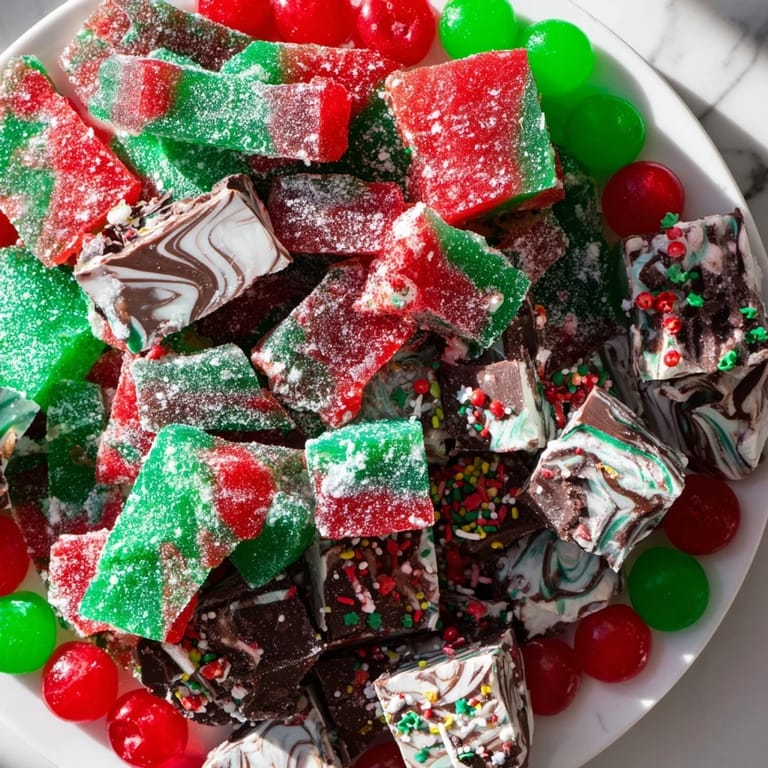 Save A festive dessert platter featuring a colorful assortment of homemade rock candies holiday-themed chocolates and sparkling sugar confections perfect for adding a sweet eye-catching centerpiece to your holiday table.