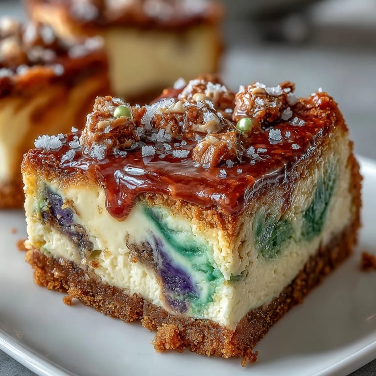 Save The year I discovered king cake, I was convinced Mardi Gras was only about parades and noise. Then my neighbor handed me a slice of that purple, green, and gold swirled bread, still warm, and something clicked. Years later, I found myself staring at a creamy cheesecake in my kitchen thinking: what if I merged these two worlds? These bars became my love letter to that realization, marrying the spiced warmth of king cake with the luxurious richness of cheesecake. They're messy, they're celebratory, and they taste like the best kind of kitchen experimentation.