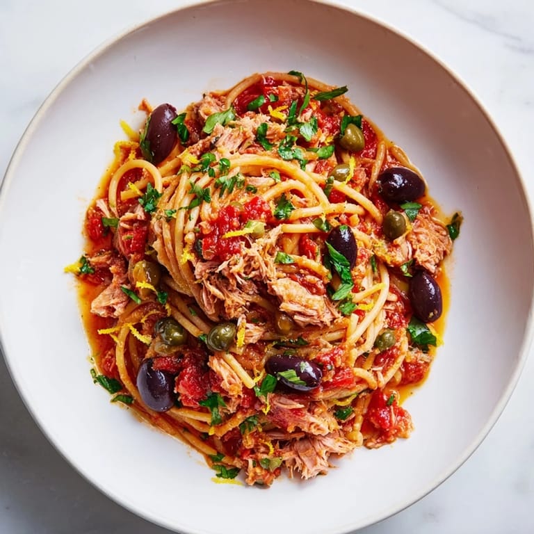 Save A vibrant, Mediterranean-inspired pasta dish featuring flaky canned tuna, briny olives, and tangy capers in a savory tomato sauce.