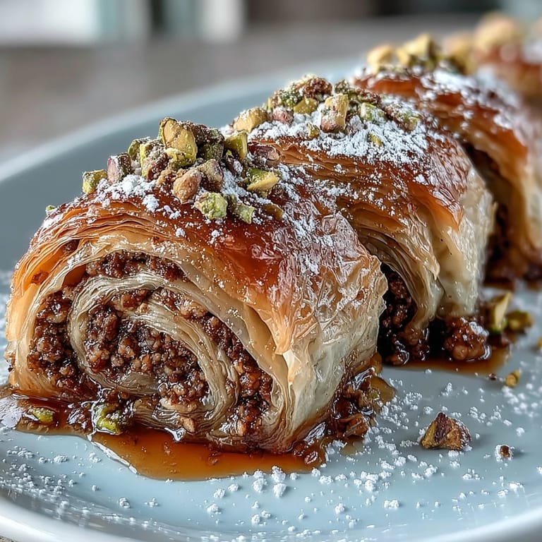 Save The first time I made pistachio baklava rolls, the scent of orange blossom water drifted through the kitchen windows and spilled onto the quiet street outside. At that moment, I wasn't chasing any grand nostalgia – just searching for something both comforting and a little celebratory on a Saturday afternoon. I could hear the crinkle of phyllo as I gently unrolled the sheets, and the kitchen counter became speckled with sugar and emerald pistachios. There was a gentle hum from the food processor, drowned out only by my own anticipation. Those delicate rolls came together in such a hands-on way, their crispness a tiny triumph after impatient waiting.