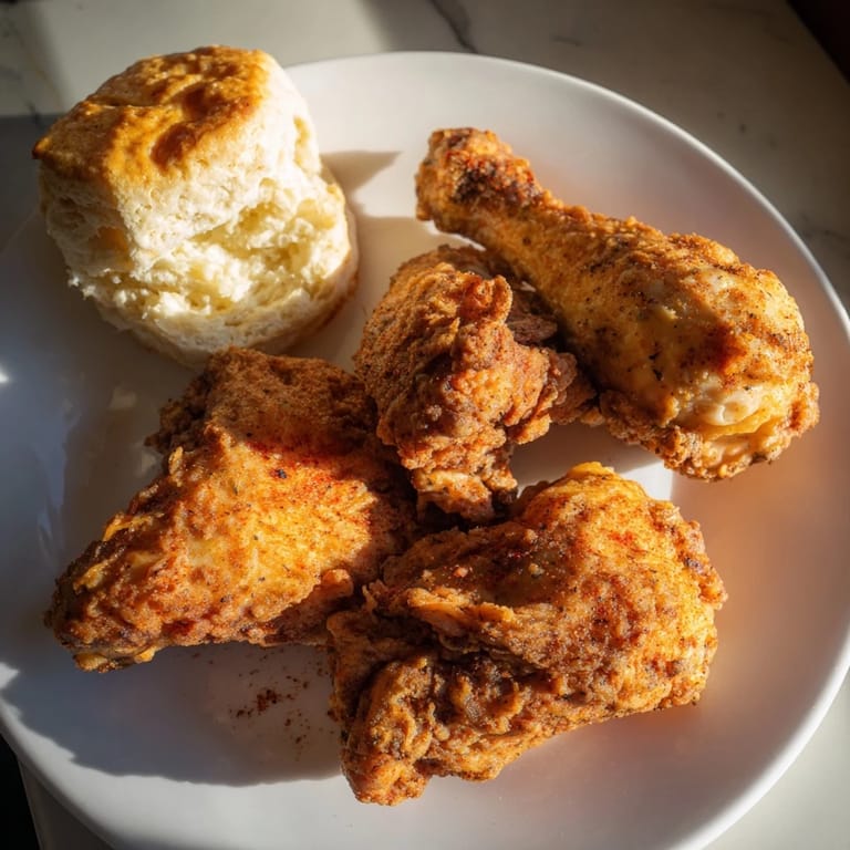 I first made this Southern fried chicken and biscuits for a Sunday family get-together, and it quickly became a tradition. Nothing brings everyone to the table faster than the smell of golden chicken and freshly baked biscuits.